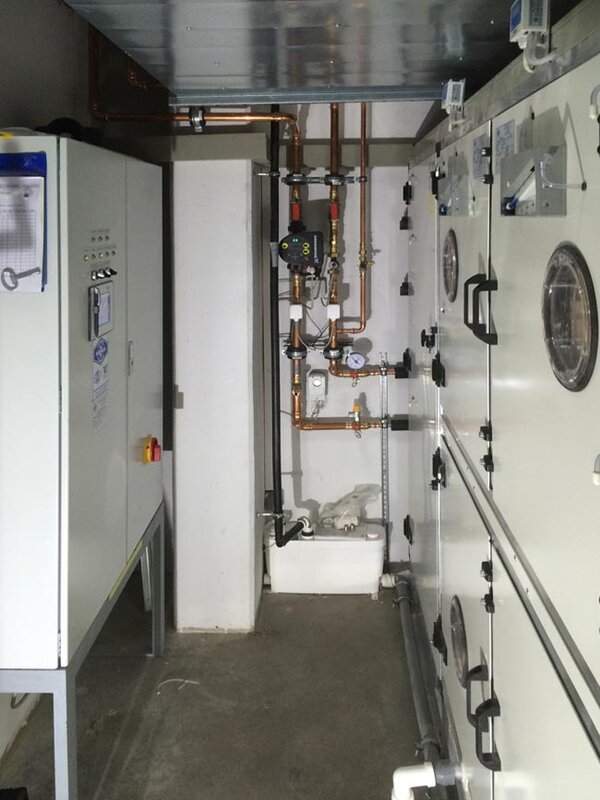 Installiertes Gerät: Zentrales Lüftungsgerät mit Regelung und mechanischer Kälteanlage sowie zusätzlicher Kälteanlage zur Versorgung von externen Verbraucher wie z. B. Deckenumluftkühlgeräten mit Kaltwasser